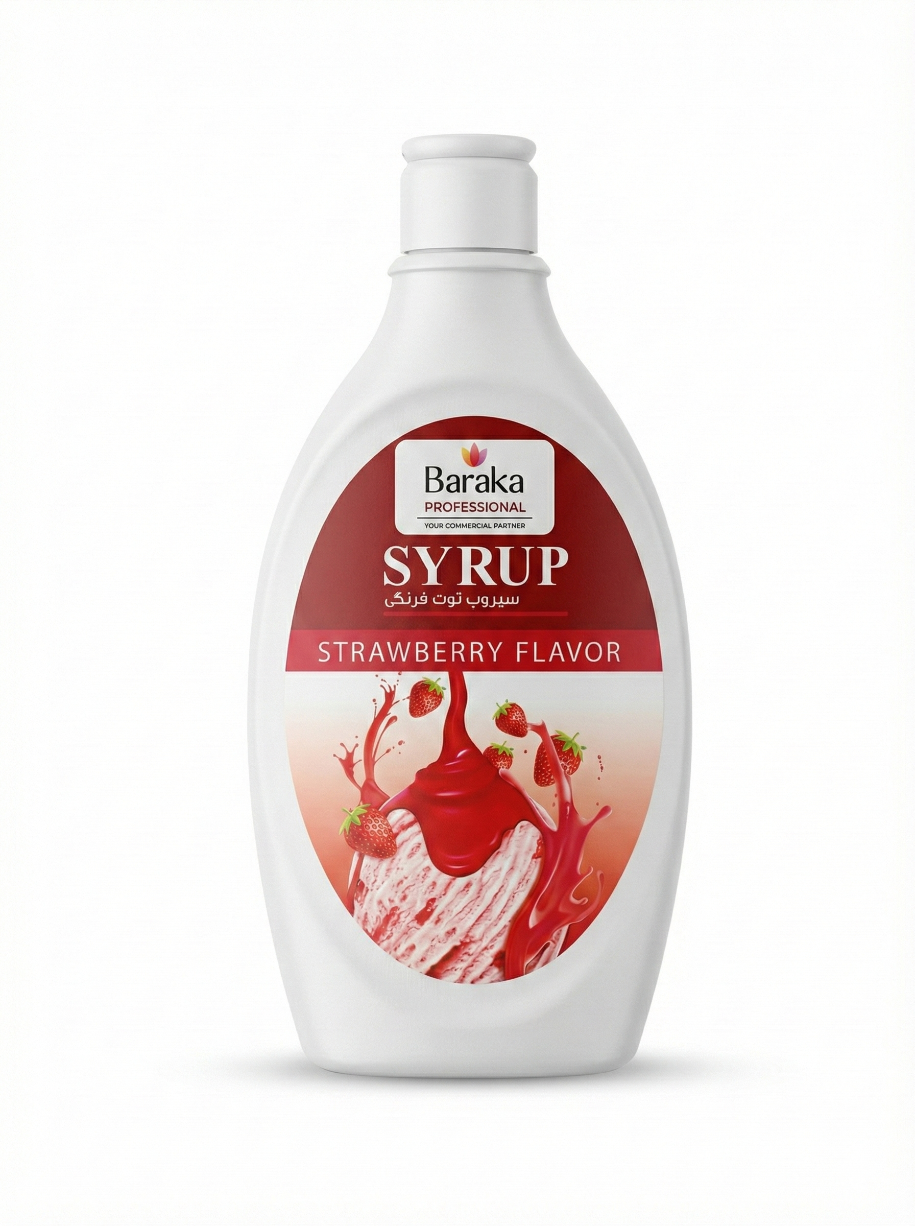 سیروپ توت فرنگی باراکا همانطور که از تصویر روی بستهبندی پیداست، این محصول غلظت و قوامی دارد که آن را برای روکش کردن (Topping) اسکوپهای بستنی و دسرها ایدهآل میسازد.